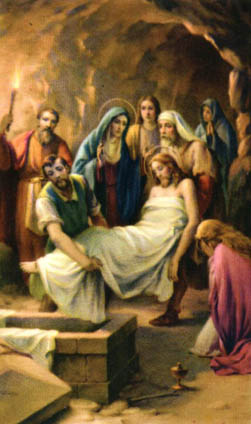 Muy cerca del Calvario, en un huerto, José de Arimatea se había hecho labrar en la peña un sepulcro nuevo. Y por ser la víspera de la gran Pascua de los judíos, ponen a Jesús allí. Luego, José, arrimando una gran piedra, cierra la puerta del sepulcro y se va (Mt XXVII,60).