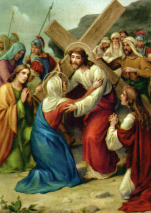 Apenas se ha levantado Jesús de su primera caída, cuando encuentra a su Madre Santísima, junto al camino por donde El pasa.
