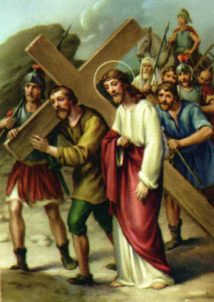 Jesús está extenuado. Su paso se hace más y más torpe, y la soldadesca tiene prisa por acabar; de modo que, cuando salen de la ciudad por la puerta Judiciaria, requieren a un hombre que venía de una granja, llamado Simón de Cirene, padre de Alejandro y de Rufo, y le fuerzan a que lleve la cruz de Jesús (cfr. Mc XV,21).