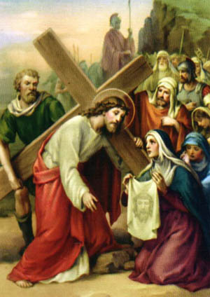 Una mujer, Verónica de nombre, se abre paso entre la muchedumbre, llevando un lienzo blanco plegado, con el que limpia piadosamente el rostro de Jesús. El Señor deja grabada su Santa Faz en las tres partes de ese velo.